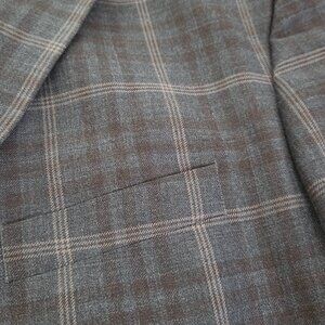This VTG Tweed Jacket is a classic and stylish addition to any man's wardrobe. Made from 100% wool in a brown beige windowpane check pattern, it exudes a timeless appeal suitable for various occasions from casual to formal. The jacket features a four-button sleeve button style, notch lapel, and a single-breasted design with a two-button front closure. With a chest size of 50 inches and a regular fit, this blazer is perfect for adding a touch of sophistication to any outfit, whether for a wedding, party, or business meeting.