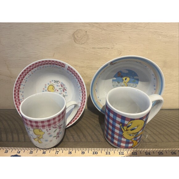 This listing is for two bowls and two mugs from the Looney Tunes franchise. The bowls and mugs feature a colorful design with the character Tweety Bird and are made of ceramic and porcelain materials. They are decorated with a painted design and are suitable for hot or cold beverages. This collectible item evokes nostalgia for fans of Warner Bros. Animation and American animation art from the 1990s.