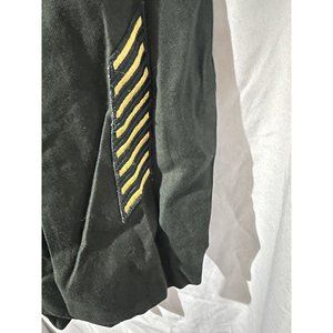 This vintage U.S. Army dress jacket is an extraordinary piece of history. Made of wool serge, it features a button closure and patches accenting the green color. The jacket is a mid-length military jacket with a spread collar style, perfect for a formal occasion. It has a solid pattern and is lined with polyester for comfort.