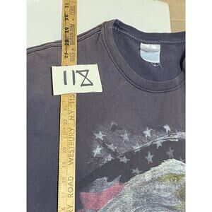 Vintage patriotic tee featuring bold “United We Stand” eagle graphic with American flag backdrop. Dark base color with Screen Stars Best tag, made in USA. Soft cotton blend with classic fit and clean back. Tagged XL, flat lay measurements shown. Pre-owned, excellent condition with no major flaws. Great for Americana drops, vintage bundles, or patriotic resale.