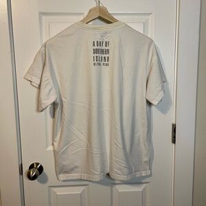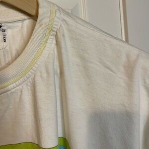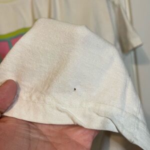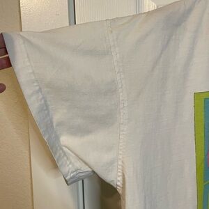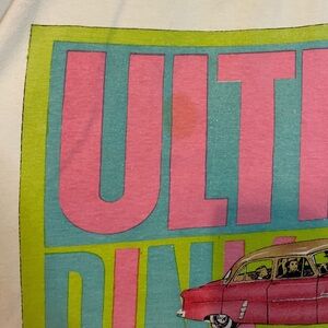 Vintage Ultra Pink white graphic retro graphic oversized tee. Crew neck boxy tee with light yellow detail on collar, large bright and bold multicolored graphic on front and smaller graphic on back.