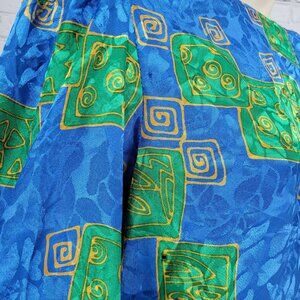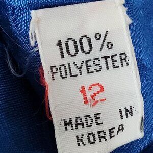 The VTG Unbranded Blue Satin Puff Long Sleeve Buttoned Back Midi Dress in size 12 is a stylish and lightweight midi dress perfect for various occasions such as travel, party, or casual wear. Made from polyester satin fabric with a geometric pattern and pleated accents, this retro-inspired dress features puff sleeves and a zip closure for easy wear. Hand wash only to maintain its vintage charm and vibrant blue color, this dress is a colorful and artistic addition to any woman's wardrobe, ideal for the summer, fall, and spring seasons. This dress exudes a playful and unique style for modern vintage fashion enthusiasts.