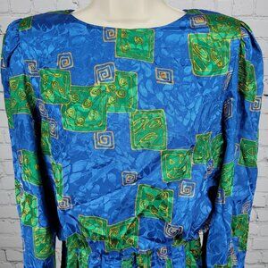 VTG Unbranded Blue Green Satin Puff Long Sleeve Buttoned Back Midi Dress Size 12