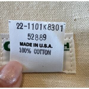 The product is a vintage Union Made OshKosh B'Gosh Sanforized Shop Work Apron, made in the USA. This original unisex apron features a tan color and is crafted from denim material. With its classic design and durable construction, this apron is a unique and nostalgic piece for collectors or those looking to add a touch of retro charm to their wardrobe or kitchen. Length 40.5”