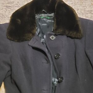 VTG United Color of Benetton Navy Wool Long Trench Coat Faux Fur Collar Size 6