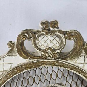 Vintage chalkware wall hanging has a cream base with brushed gold accents and was originally made to have a "distressed" finish. Oval shaped with a hanger on the back and a wire mesh for stability. The piece showcases a Victorian man proposing with an engagement ring in his hand. He is dressed in his best and carrying a cane. The piece is highly detailed. Marked Universal Statuary Co Chicago 1958 on the top right side.
