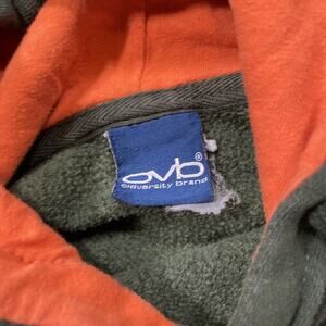 The product is a vintage University of Miami Hurricanes NCAA football fan apparel from the OVB Old Varsity Brand. It is a men's size medium sweatshirt in green and orange colors, with the team logo of the Miami Hurricanes. The hoodie is unisex and features the team's colors on the inner hood, making it a stylish way for fans to show their support for the team.