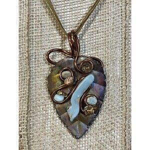 This vintage unsigned Miriam Haskell? style copper leaf turquoise pendant choker necklace features a teardrop pendant with a simulated turquoise stone set in a cluster style. The necklace is handmade with adjustable ribbon and cord chain, making it suitable for various occasions such as Mother's Day, engagement, Christmas, graduation, anniversaries, birthdays, and more. The boho, hippie, and gypsy-themed pendant exudes an art-to-wear style, perfect for those who appreciate unique and eclectic jewelry pieces. Made in the United States during the 2000s, this nickel-free pendant is a timeless addition to any vintage jewelry collection.