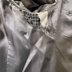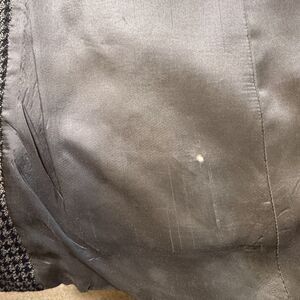 Wool is in good shape, one button is missing from sleeve cuff, lining is in pore shape - scratched/pulled throughout and torn in several places - both sleeve cuffs, and around one of the sleeves.