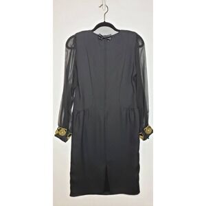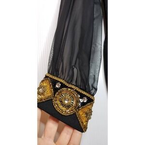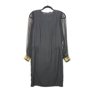 Vintage Ursula of Switzerland Petite Black Sheer Long Sleeve Gold Beaded Cocktail Dress 6