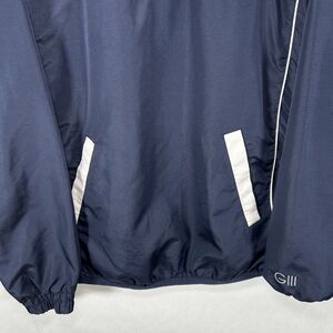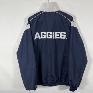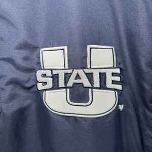 The VTG Utah State Aggies GIII Sports Carl Banks 1/4 Zip Windbreaker Jacket in size Medium is an officially licensed fan apparel for men. This blue jacket features the Utah State Aggies team logo and is perfect for showing support for the team in a stylish and comfortable way. Made by G-III, this jacket is a great addition to any fan's wardrobe.