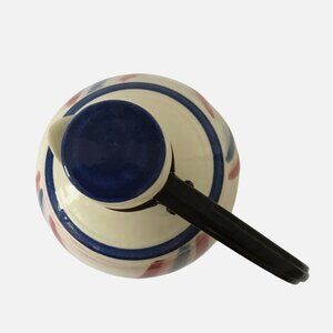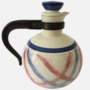 Bring classic mid-century charm to your kitchen or collection with this vintage VERNONWARE ceramic carafe, hand-painted with bold red and blue curved stripes in a timeless Americana palette.