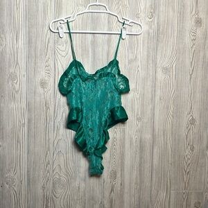 VTG VICTORIA'S SECRET GOLD LABEL GREEN LACE SATIN RUFFLE ONE PIECE TEDDY*XS