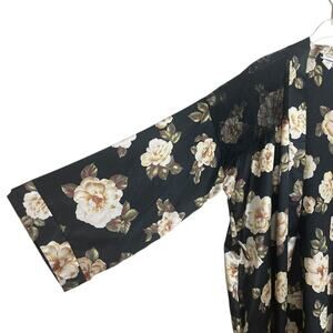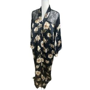 Beautiful floral long robe with lace detail to shoulders. Long sleeves, inner tie. 100% polyester. Black with cream and gold colorway. No size tag other than petite. Measures out to be approx. an XL petite. Please see photos for measurements. THERE IS NO BELT.
