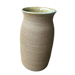This vintage 4.75" tall studio artisan crafted and signed vase is made of an earthy light brown to gray with speckled yellowish green with blue glazed interior and a floral or seed pod with leaves external 3D accent with orangish brown and yellow colors. This stoneware pottery vase was hand formed on a wheel and retains a parallel line or ribbed texture. It is in good pre owned clean condition with remnant artisan tooling marks and nuances within the pottery, no breakage issues. Please review the pictures for more details and size measurement information, thank you.
