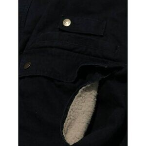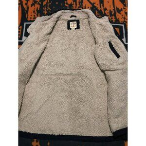 Sherpa lining and pockets, steel buttons, and a zipper.