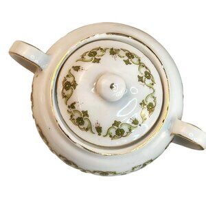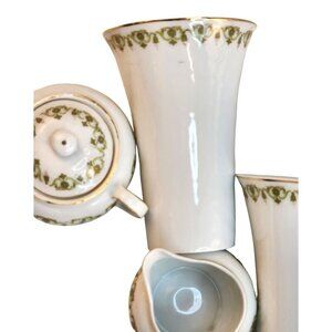 This exquisite VTG Victoria Austria Green Floral Pattern Gold edging sugar & creamer set with 2 vases offers a vintage touch to your table setting. Crafted from durable porcelain, it flaunts a green floral pattern against a white background, and gold edging for a refined look.