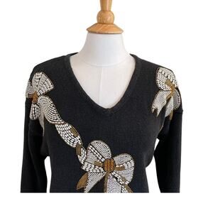 VTG Victoria Harbour Black Beaded V-Neck Holiday Sweater Gold Silver Bows M