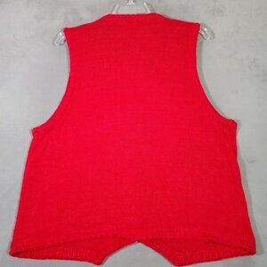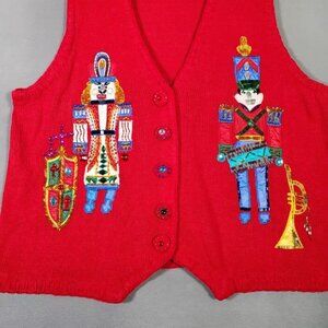 Vintage Victoria Woman plus size 2X Christmas holiday sweater vest in bright red. Features heavily beaded and embroidered nutcracker soldiers, trumpet, and shield with festive detail. Three red embellished buttons at front. Made of 55% ramie and 45% cotton. Made in Hong Kong. This is a true vintage piece, great for holiday parties, ugly sweater contests, or a fun festive look with a nostalgic Y2K retro vibe.