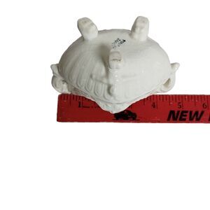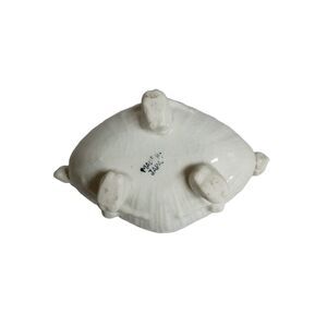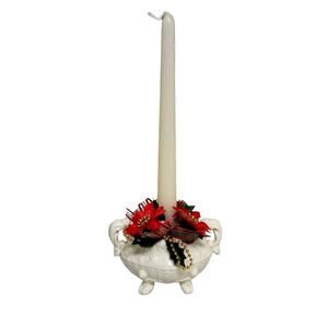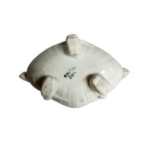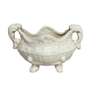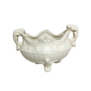 Ornate vintage Victorian-style white majolica candle holder with cherub feet and detailed handles. Neutral white color makes it versatile for year-round use, from Christmas and Valentine’s décor to elegant home displays. Good condition with some crazing and minor manufacturing flaws typical of vintage pottery. Candle not included.