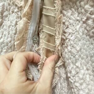 The bodice features ribbon and lace long sleeves. No labels anywhere. There is one missing snap that I will leave for the new owner to replace. No rips or tears.
