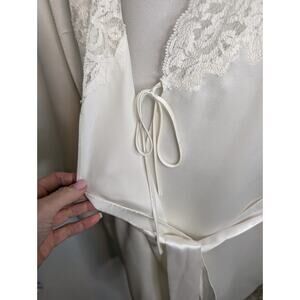 Beautiful vintage 90s white satin kimono style wrap robe with lace trim.