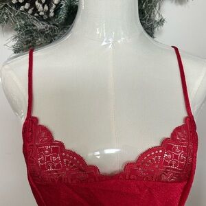 A beautiful Red Camisole with Lace Trim around the neckline.
