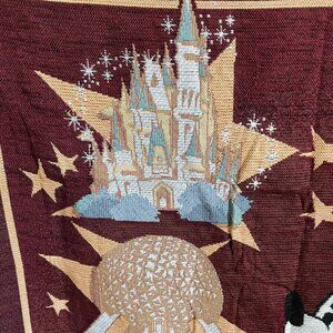 This enchanting throw features the beloved Mickey Mouse in a cheerful pose at the center, set against a rich maroon background that captures the warmth and excitement of Disney. Adorned with iconic symbols from the park, including a chic silhouette of Cinderella's Castle and whimsical swirls and stars, this blanket is a nostalgic tribute to the Happiest Place on Earth. Finely crafted with durable knitting, it promises to deliver comfort and durability for countless cozy moments. The fringed edges add a touch of homey charm, making it a perfect accent piece for any couch, bed, or reading nook. Measuring approximately 50 inches by 60 inches, it's the perfect size for snuggling on chilly evenings or adding an extra layer of comfort to any living space.