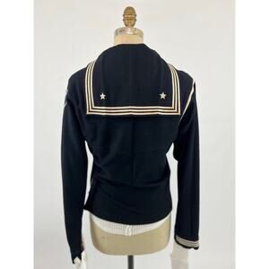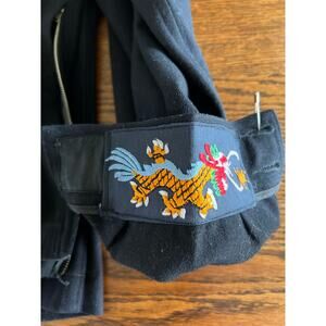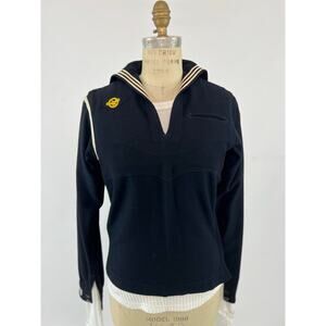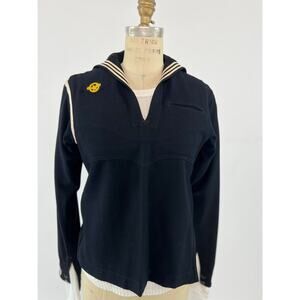 Authentic VTG 1940s US Navy Seabees wool dress jumper. Features the classic sailor flap-collar with double star embroidery, side metal zipper, and the iconic Seabees patch on the right shoulder. Left cuff is detailed with a hand-embroidered Asian dragon — a popular souvenir motif from the Pacific theater era.