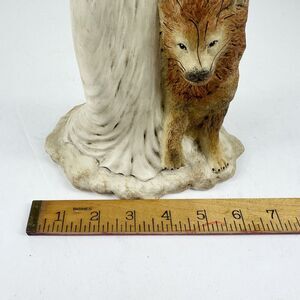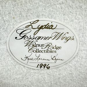This is a vintage figurine titled "Lydia" from the Gossamer Wings collection by Walnut Ridge Collectibles. The figurine features an angel with a sheep and lion, standing 10 inches tall and 7 inches wide. It is signed and was manufactured in 1996.