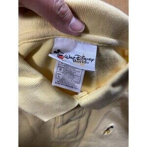 This vintage Walt Disney World polo shirt features an embroidered Mickey Mouse design on the front, capturing a 90s retro theme. Made of 100% cotton in a light yellow color, the shirt has a collared neckline and short sleeves, offering a regular fit in size L. The classic solid woven fabric adds to the nostalgic appeal, making it a unique piece for Disney enthusiasts and fans of retro fashion. Perfect for all seasons, this shirt is a timeless addition to any wardrobe, suitable for activities like walking or golfing.