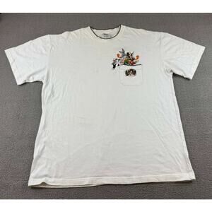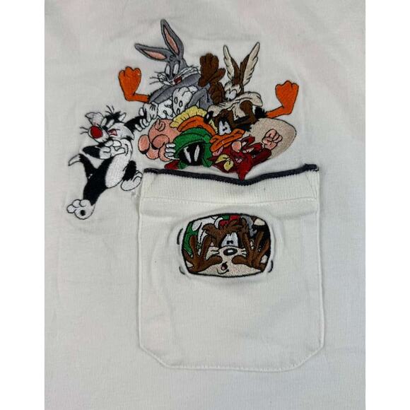 Warner Bros Studio Store T Shirt in white unisex XL. Vintage 1999; made of 100% cotton with chest pocket and embroidered Looney Tunes characters including Taz on the pocket. Easy to style for casual streetwear and festival looks.