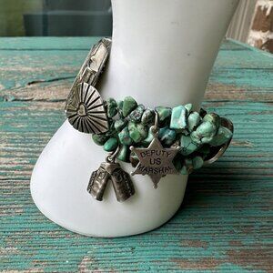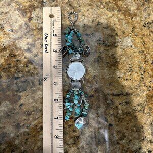 Vintage Native American Sterling Silver Turquoise Charm Watch Bracelet 5.5" Length, Watch in Working Order with new battery. Watch Face is Marked and Made of Pearl Watch Bevel is Ornate Heart Shaped Conchos Stamped PTG Sterling Made by Phillip Guerro Who Is an Active Master Silversmith from Canyoncito, New Mexico. All Turquoise Nuggets Are Natural Stone. All Charms Marked Sterling Silver Deputy US Marshall Native American Chief Feather Bonnet Western Cowboy Hat Horse Riding Chaps and A Hammered Buffalo Nickel, 53.9 grams. Most charms stamped with 925 Sterling Silver purity hallmarks, has natural turquoise stone nugget beads. This watch is in good pre owned clean condition with some use wear on the sterling silver metal along with minor removable tarnish, the clasp functions properly, no issues. Pease see test video or request if required a video for demonstration that watch is in proper working condition.