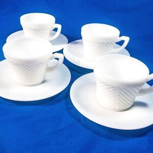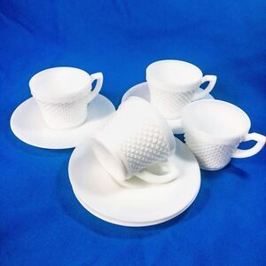 Service for four Westmorland milk glass cups and saucers in the English Hobnail pattern.