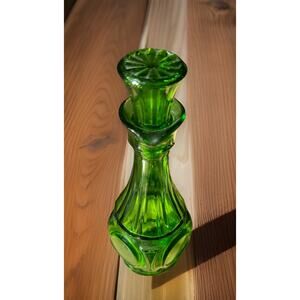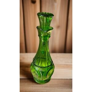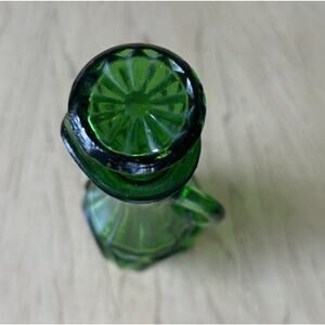 The product is a vintage Wheaton Emerald Green Cruet with a bull's eye pattern, standing at 8 inches tall. Made of glass, this mid-century modern piece is a unique addition to any table setting or decorative display. The bull's eye pattern adds a playful touch to the elegant green color, making it a standout piece in any collection. Perfect for serving oils or vinegars at the dinner table or as a statement piece in a dining room.