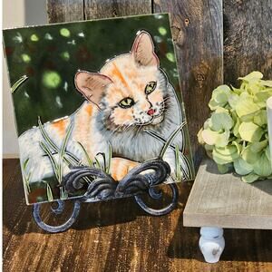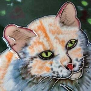 Whimsical Orange Tabby Cat Handmade Ceramic Tile - Unique Cat Wall Art (8x8) Because of the vintage age of the tile, it does have crazing, but no chips. Great for backsplash kitchen or bathroom or just to display as vintage art. Add a pop of feline charm to your space with this Ceramic Glaze Art Tile featuring an adorable Orange Tabby Cat in a lush green grass setting. Hand-painted with meticulous attention to detail, this 8x8 tile is perfect for cat lovers looking to add a whimsical touch to their home decor. Display it on a wall to bring a touch of playful elegance to any room.