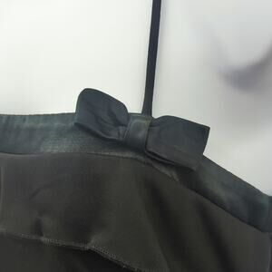 Vintage 90s black slip-style dress featuring spaghetti straps, ruched side detail, and a satin bow accent at the neckline. The sheer hemline overlay adds a soft finish, while the stretch lining offers comfort and wearability. A versatile Y2K-era piece that works well for cocktail parties, evening events, or retro-inspired styling.