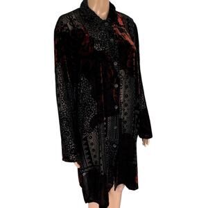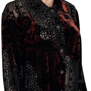 Absolutely stunning sheer burnout velvet button-down duster featuring a romantic floral and lace pattern in deep black and rust red tones. Lightweight mesh overlay creates a soft flowy drape — perfect for layering over dresses, camis, or jeans. Vintage-inspired and richly textured, this piece captures that mystical Whimsigoth and Boho charm with a touch of romantic grunge edge.