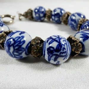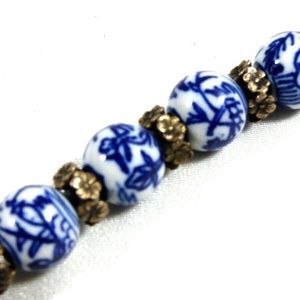 White & Blue Round Porcelain beads silver tone spacers and clasp bracelet 8"L
