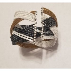 VTG White, Gold, Black Tone Bracelet Twisted Beaded Cuff Band Wide Retro Bangle