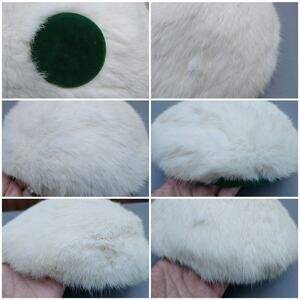 White genuine fur w/ natural variation in color: white/off white subtle highs/lows. As far as I can tell, this is rabbit fur. Green velvet disc on top. Green felt lining. Half hat Fascinator styling. Issues noted in photos. Very good preowned condition, overall. Exact age unknown, but this is likely a vintage 50s or 60s piece. Made by Sonni California.