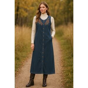 Step back in time with this vintage White Stag embroidered denim maxi dress. Made from 100% cotton, this timeless piece features delicate embroidery, a full button-front design, and convenient pockets. The tank-style top and maxi length create a flattering silhouette, perfect for casual wear, layering, or styling with boots and a cardigan for a classic vintage look.
