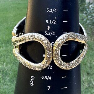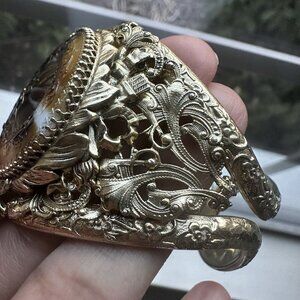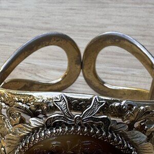 This vintage signed Whiting & Davis with maker's marks hinged bracelet size 6.25 is a rare find for any jewelry collector. The ornate gold plated cuff and bangle style is adorned with a beautiful cabochon slag glass medallion cameo featuring a stunning floral design. The stylized art glass medallion is a mixture of honey and amber colors and was hand set into an ornate prong style bezel. This is a top of the line vintage clamper style cuff bracelet made in the USA, collector investment quality MCM mid century modern fashion jewelry piece. This size 6.25 women's cuff bracelet is in excellent pre owned clean condition with some trace use wear, the glass cabochon is in excellent shape, hinges function smoothly, very well maintained over many decades. Please review the pictures for more details and size measurement information, thank you.