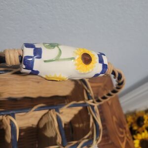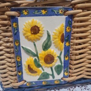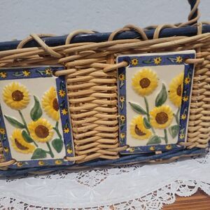 VTG Wicker Divided Silverware Caddy Basket Sunflower Ceramic Tile Hand Painted