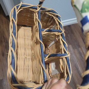 This VTG Wicker Divided Silverware Caddy Basket with a sunflower ceramic tile that is hand-painted is a unique and charming piece for your home decor. The farmhouse style and garden theme make it a perfect addition to your outdoor or indoor space. This rectangular basket is medium-sized, with dimensions of 11 inches in length, 13 inches in height, and 7 inches in width. It is made of ceramic and wicker materials, featuring handpainted details and handles for easy transportation. The natural design and handcrafted quality make this basket a lovely and functional piece for organizing silverware or other small items in your home.