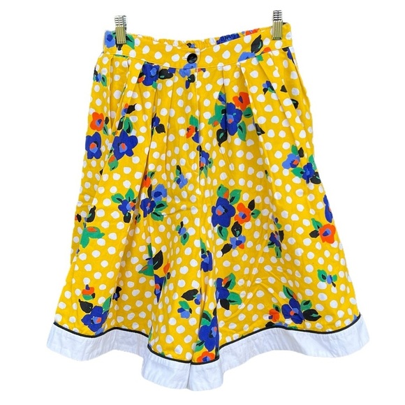 Vintage Wide-Leg Culotte Shorts by Howard Wolf. Tagged size 12 (Runs small-see measurements for best fit). Paper tag, marked Made in USA. Bright and bold yellow floral pattern with white circle polka dots. Pleated front, White trim with piping, elastic waist with button and zip closure. Extra wide leg. So cute for Spring and summer!