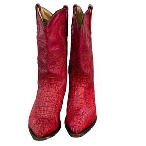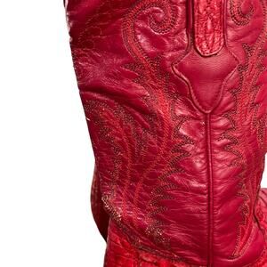 Keywords: western boots, exotic leather boots, cowgirl boots, rodeo footwear, red cowboy boots, statement boots, women’s size 7.5, vintage country style