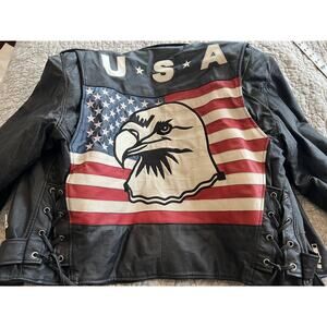 Womens VNTG Leather black leather motorcycle jacket with American Eagle USA on back