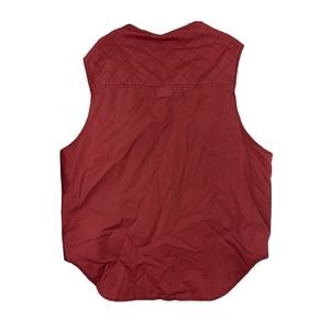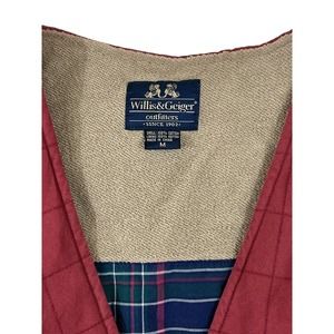 This vintage Willis & Geiger men's jacket and vest combo is perfect for outdoor enthusiasts. The outer shell is made of cotton and features a red solid pattern with embroidered logos on the accents. The jacket has a stand-up collar and a hood for added protection from the elements. The closure consists of both a zip and button, and the jacket length is short. The jacket also includes features such as a hood and is suitable for winter, fall, and spring seasons. The size is regular and fits like a size M. This item is perfect for those into hunting, fishing, or the great outdoors.