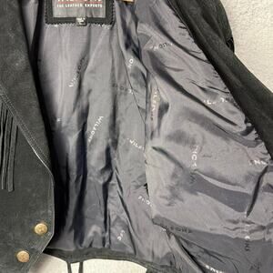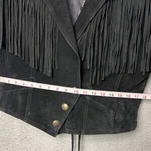 Vintage Wilsons Leather black suede western fringe cropped jacket. It features prominent fringe detailing across the front, back, and shoulders, as well as lacing at the cuffs and back of jacket